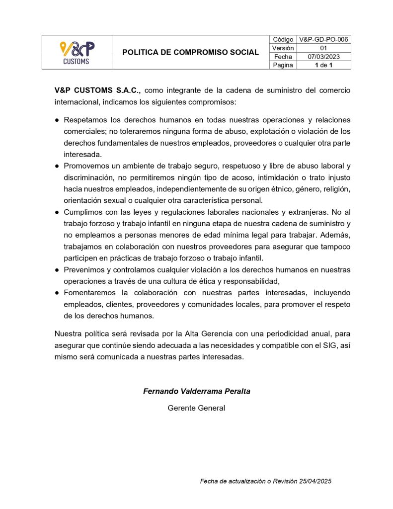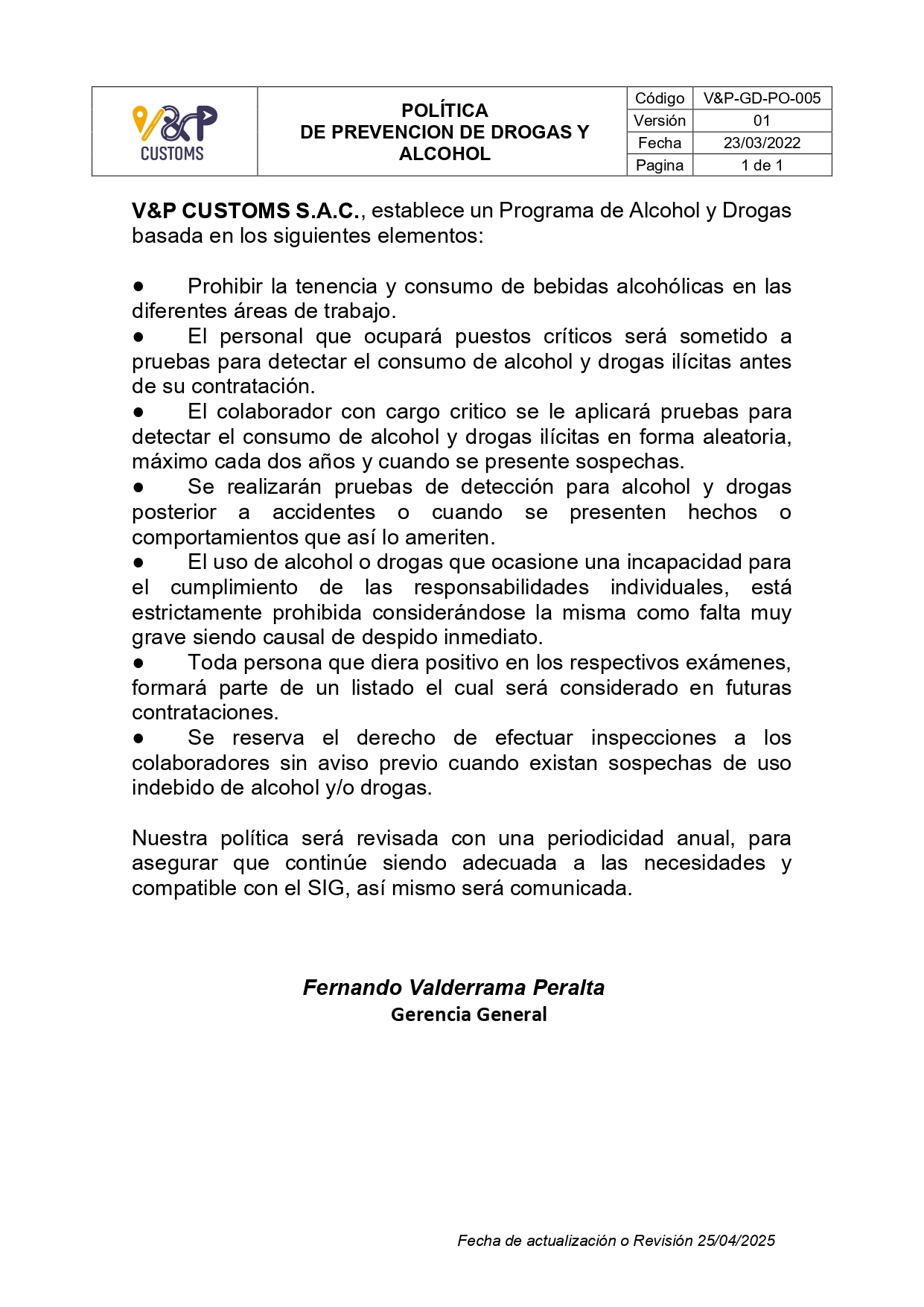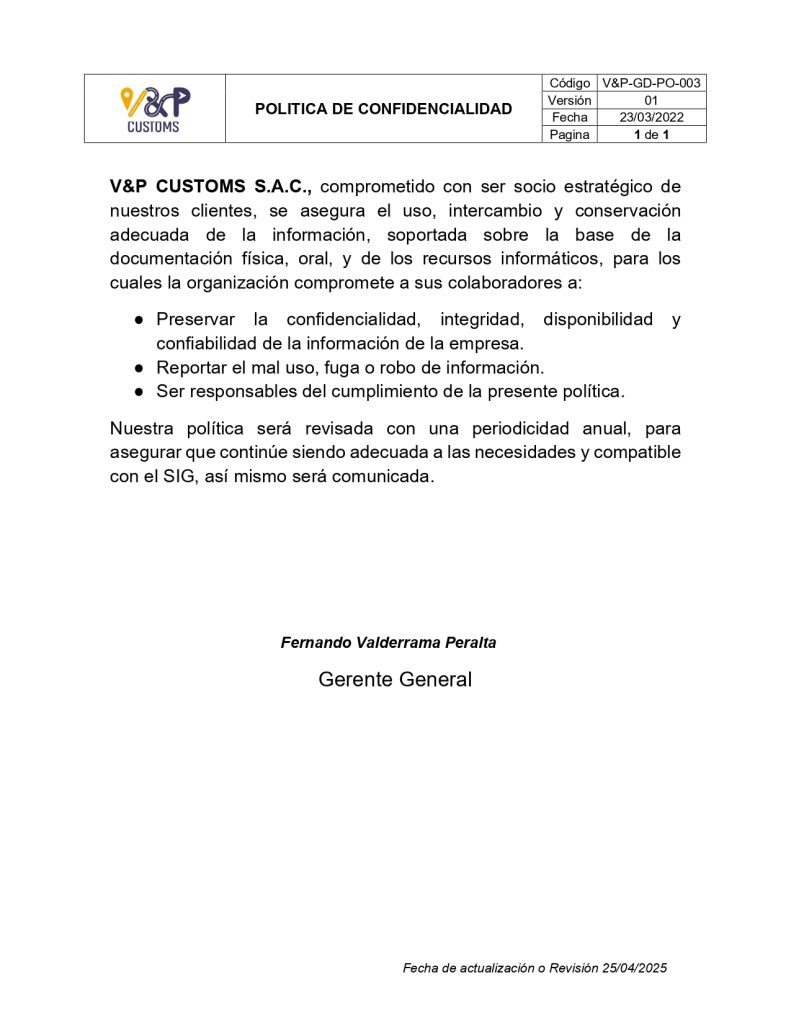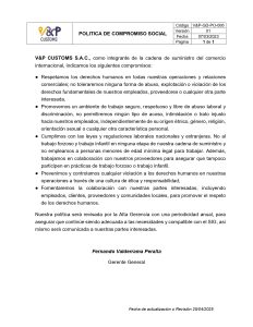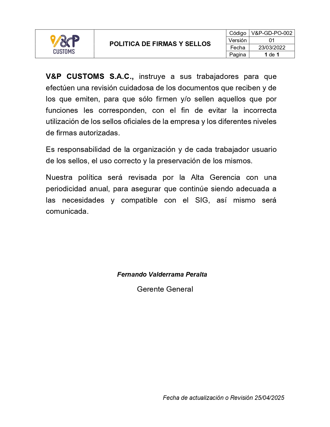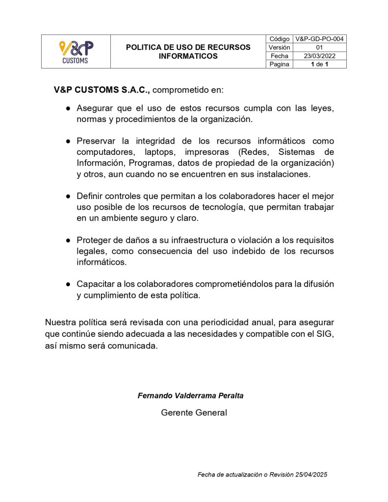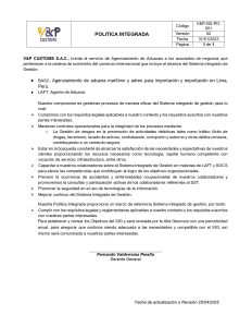 POLITICA INTEGRADA Ver política POLITICA DE FIRMAS Y SELLOS Ver política POLITICA DE CONFIDENCIALIDAD Ver política POLITICA DE USO DE RECURSOS INFORMATICOS Ver política POLITICA DE PREVENCION DE DROGAS Y ALCOHOL Ver política POLITICA DE COMPROMISO SOCIAL Ver política